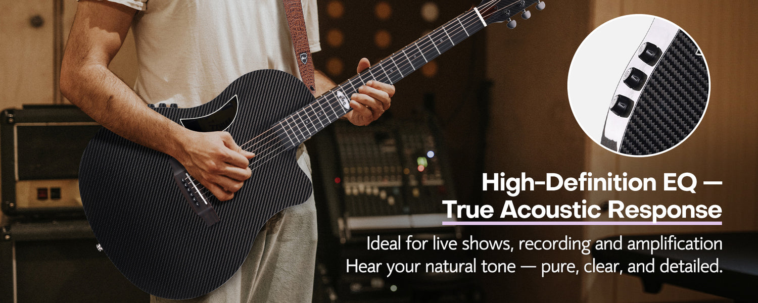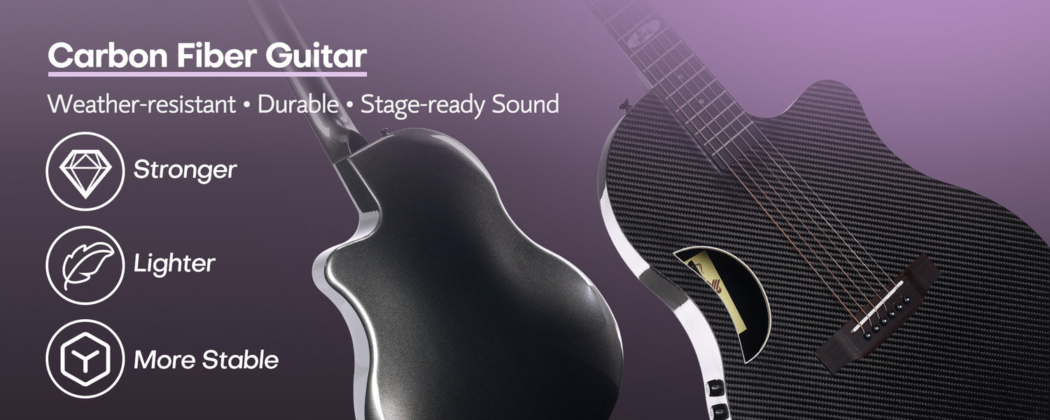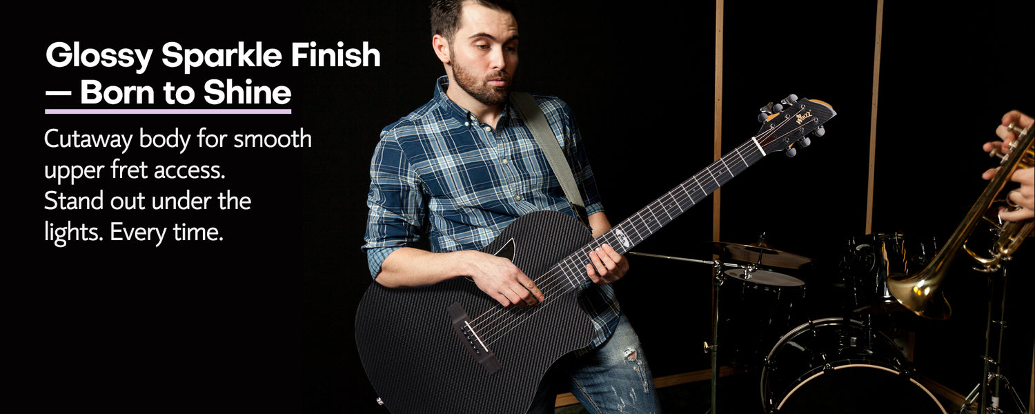 • Durable Carbon Fiber Top – Black carbon fiber top ensures stable performance and modern style; mahogany laminated back & sides provide warm, balanced tone.